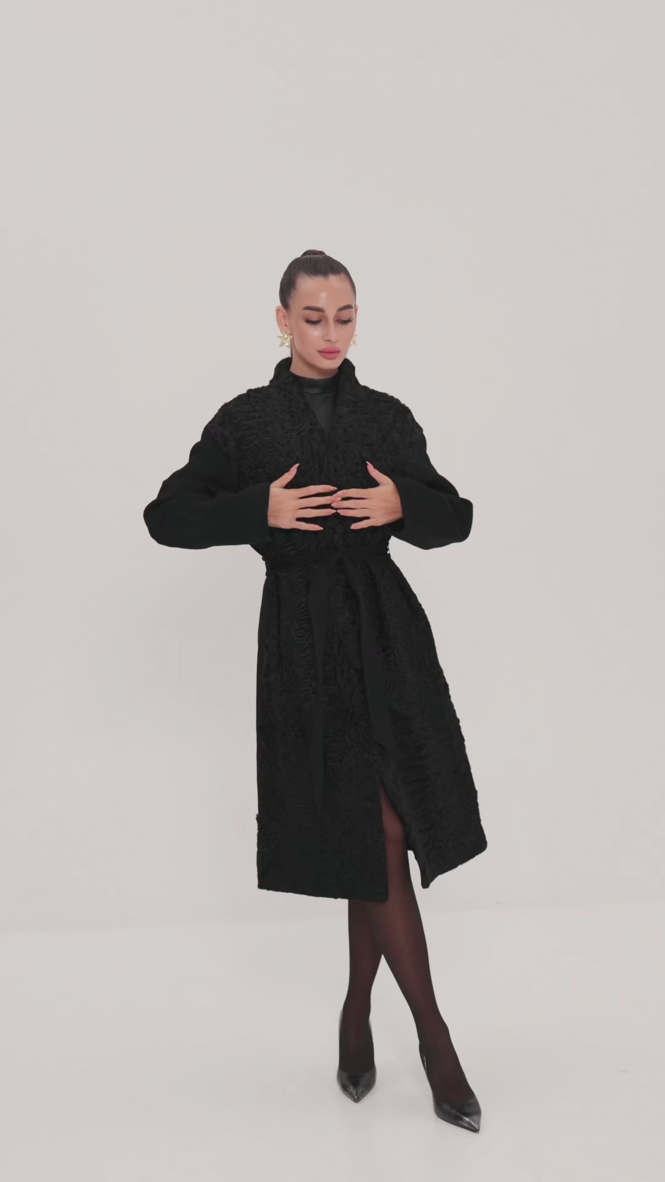 An elegant 100% wool coat elevated with luxurious karakul fur panels, showcasing the signature silky curls of this rare and prestigious material. The belted waist creates a flattering silhouette, while the smooth wool sleeves add balance and refinement. A timeless statement piece that blends warmth, sophistication, and artisanal craftsmanship.