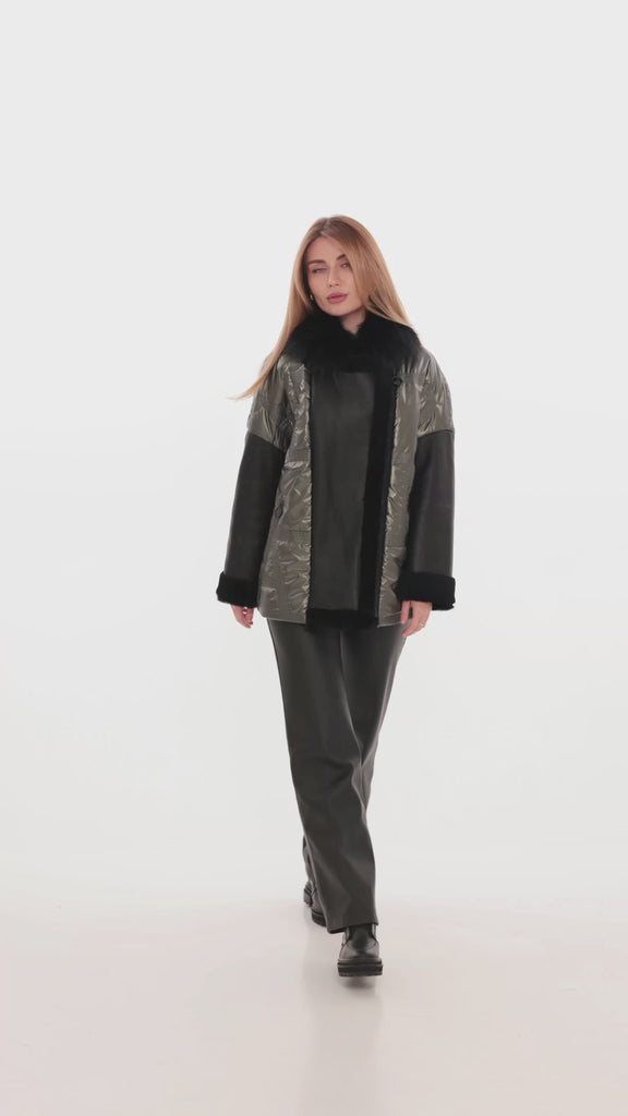 Audrey Genuine Lamb Leather Fox Fur Down Coat in Olive