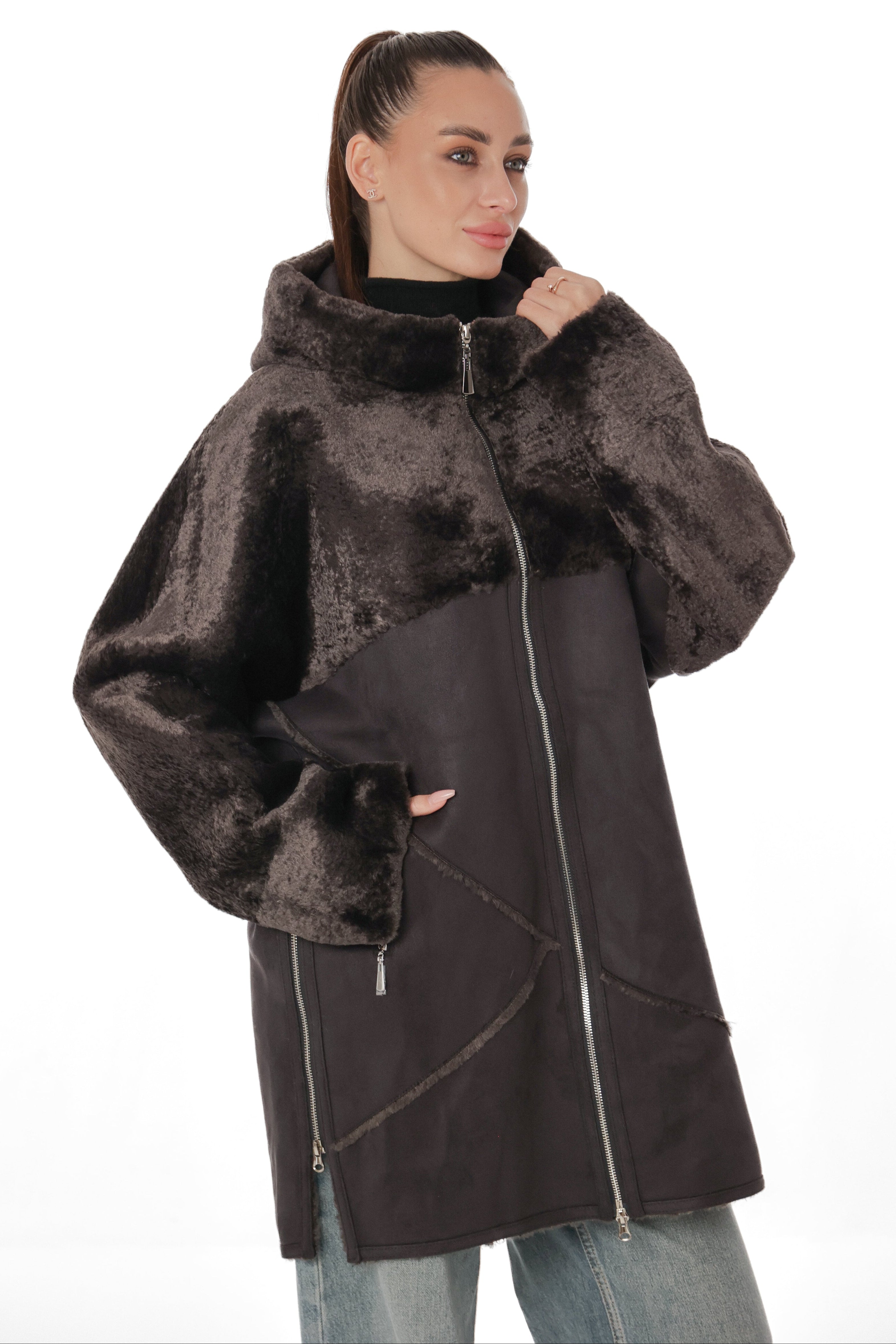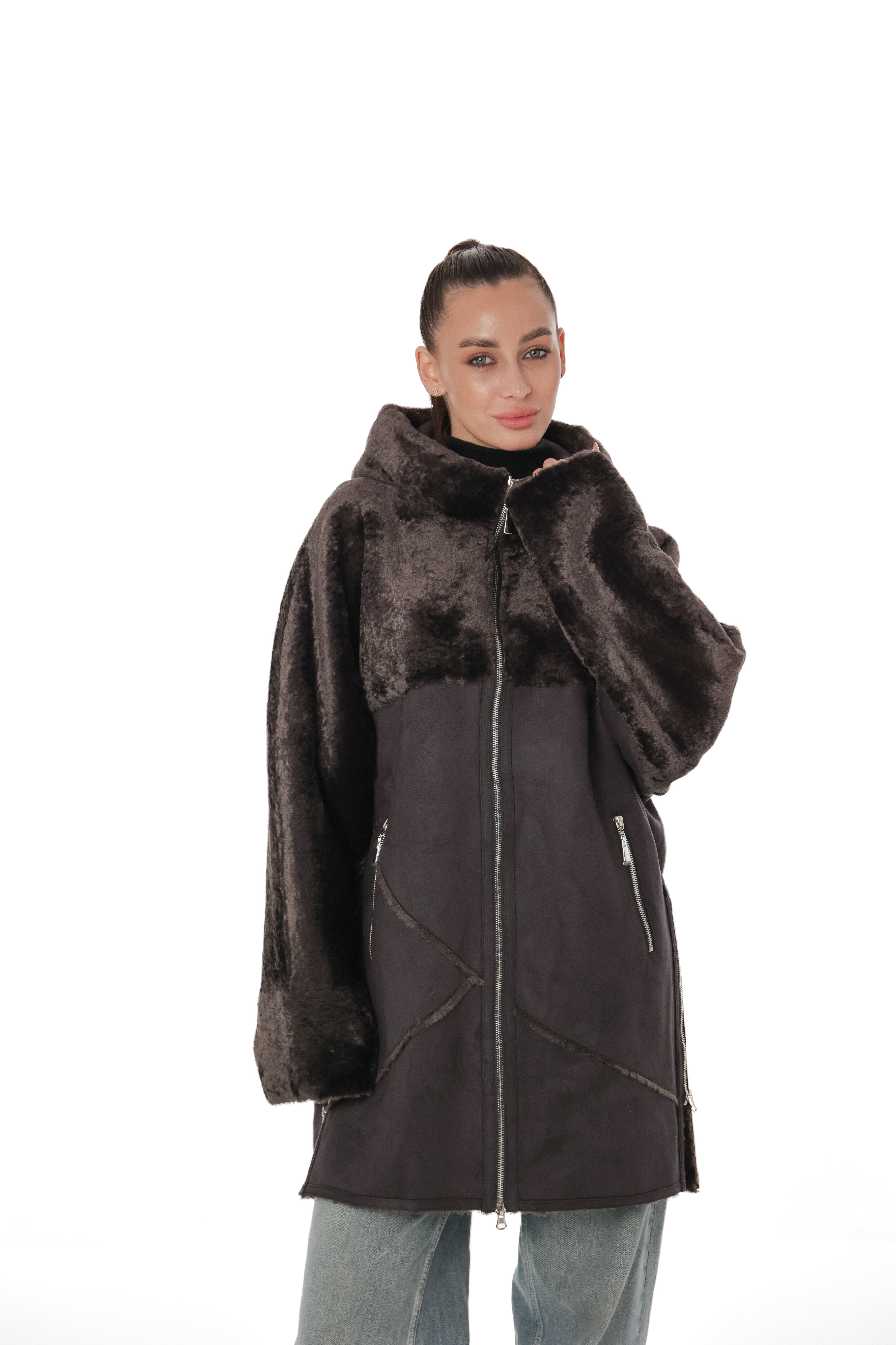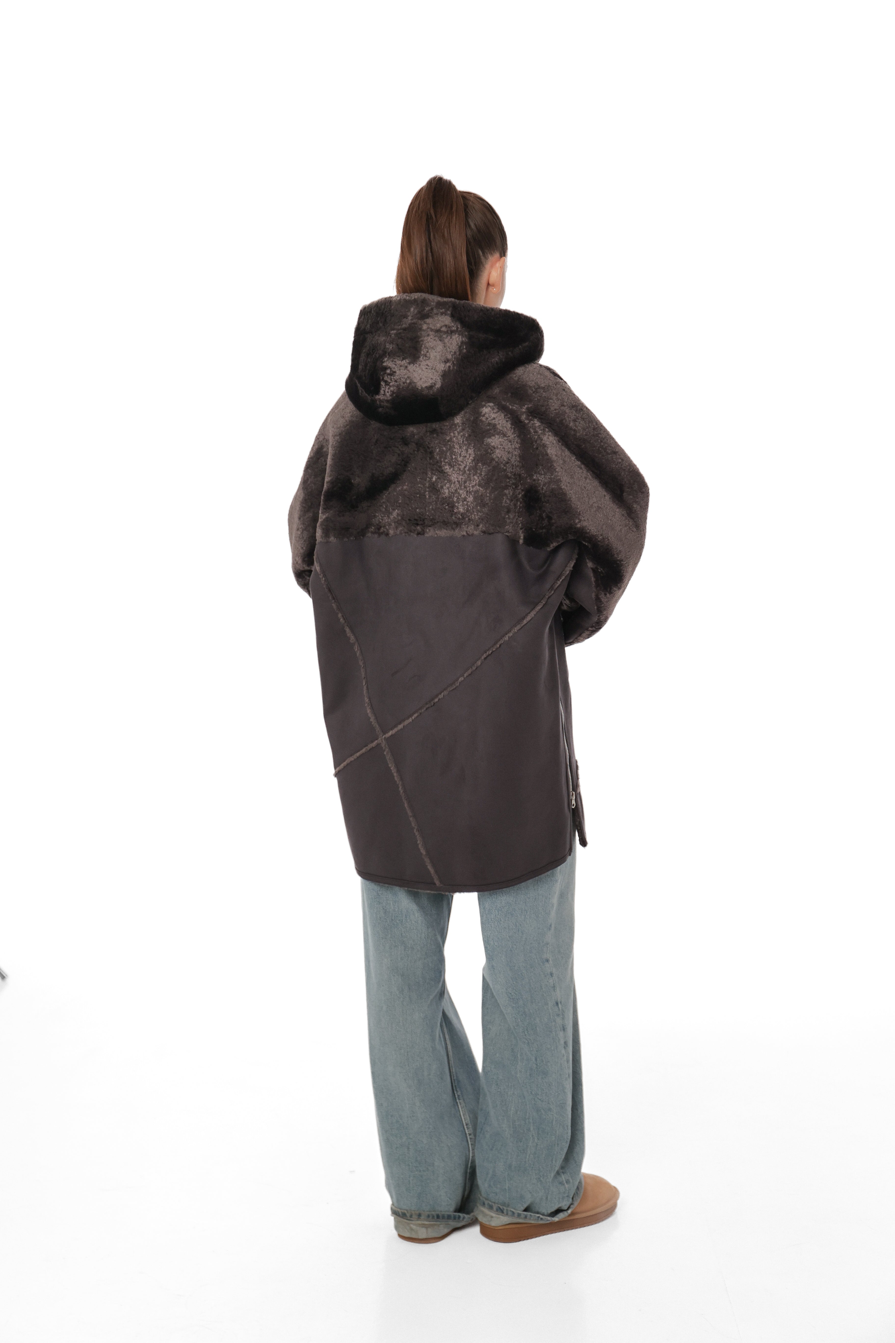 Hooded Wool Blend Eco-Suede Coat