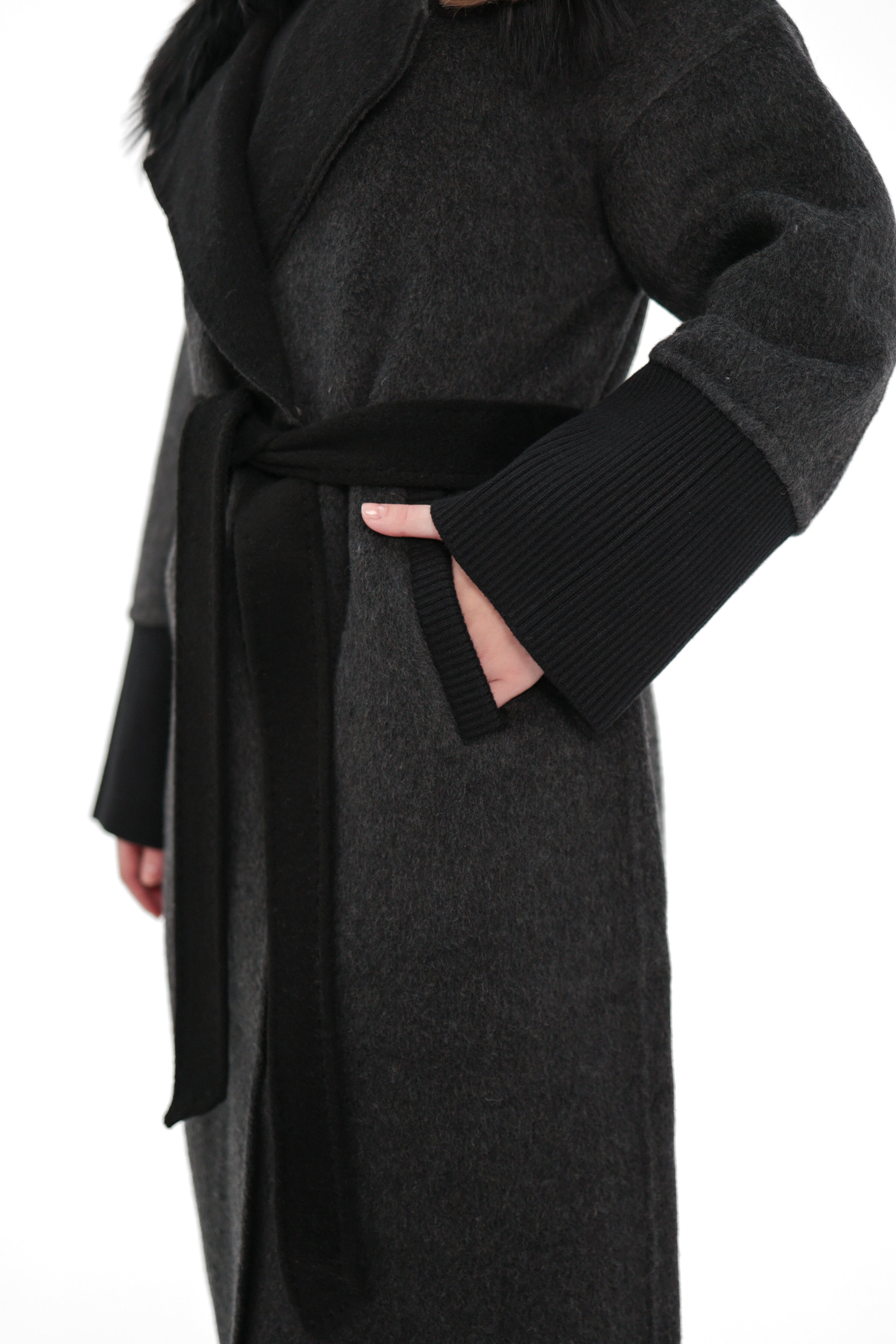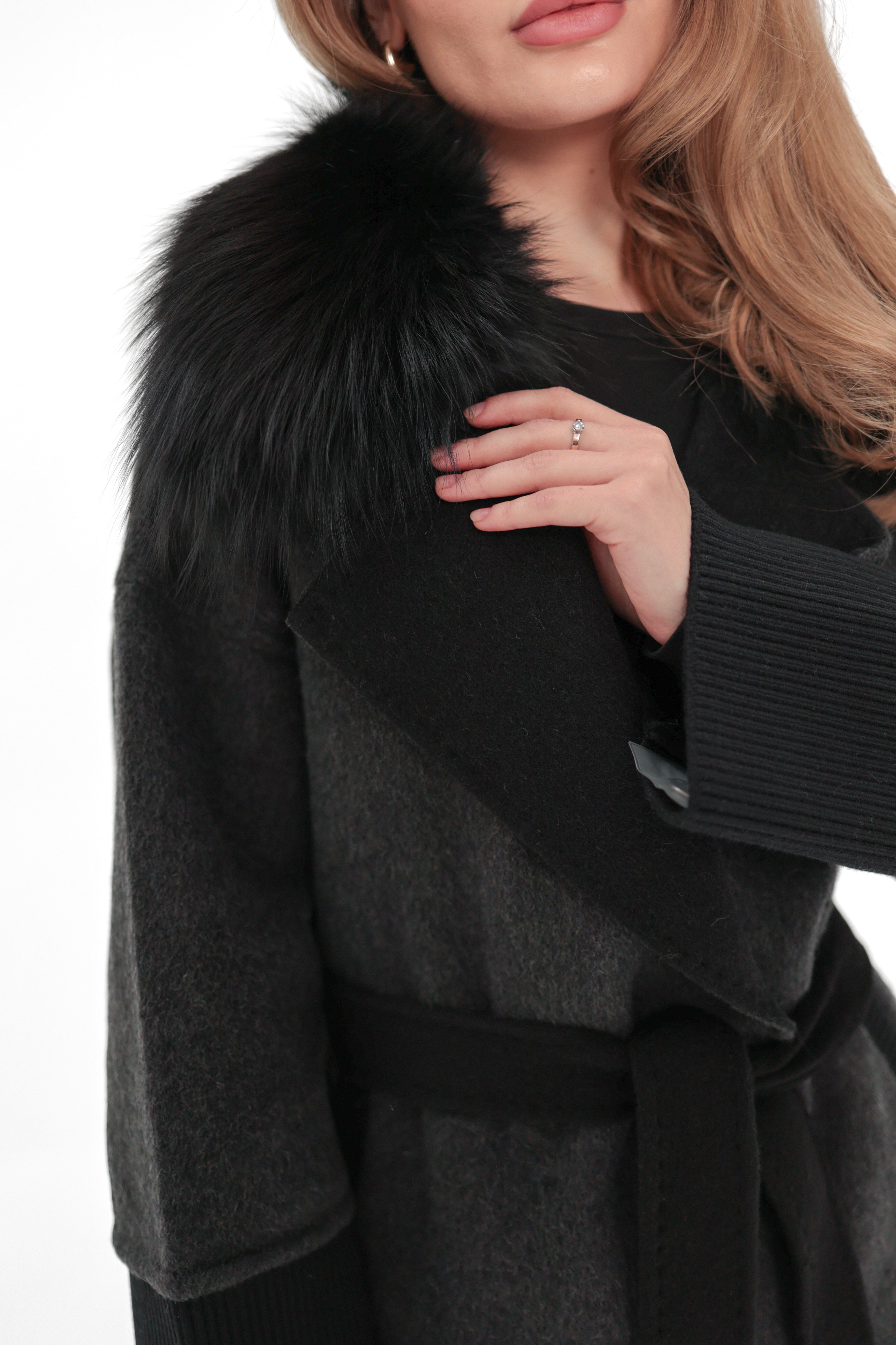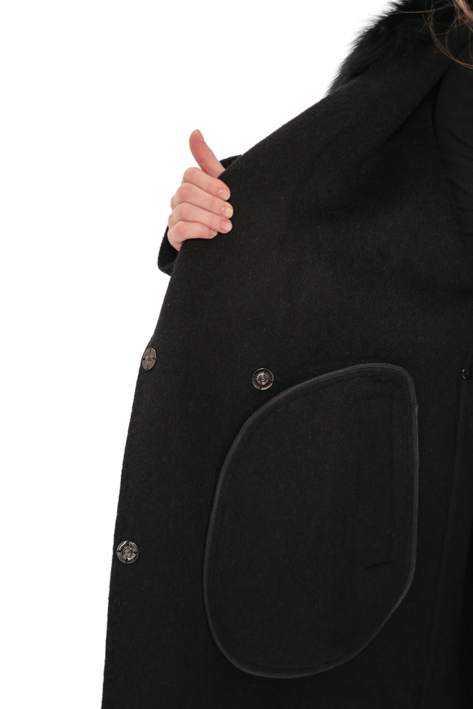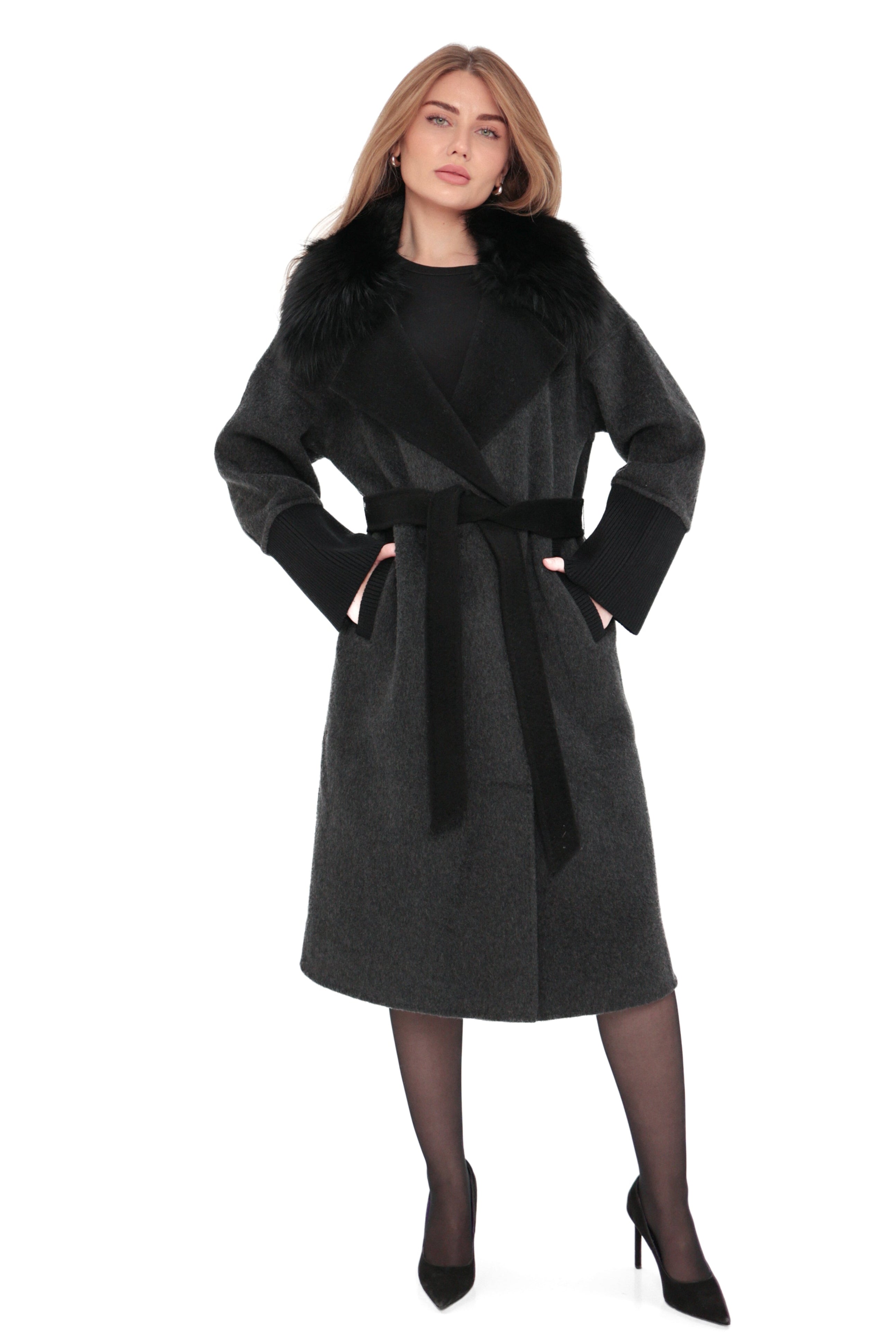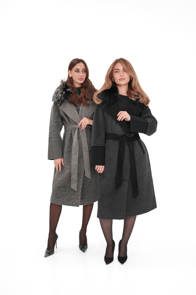 Embrace timeless luxury and sophisticated warmth with our cashmere wool blend coat, elegantly adorned with genuine Silver fox trim. This premium coat is meticulously crafted from the finest wool, offering unparalleled softness and insulation. The luxurious Silver fox fur trim around the collar and front panels adds a touch of elegance and refinement, making this piece a perfect statement for any occasion.