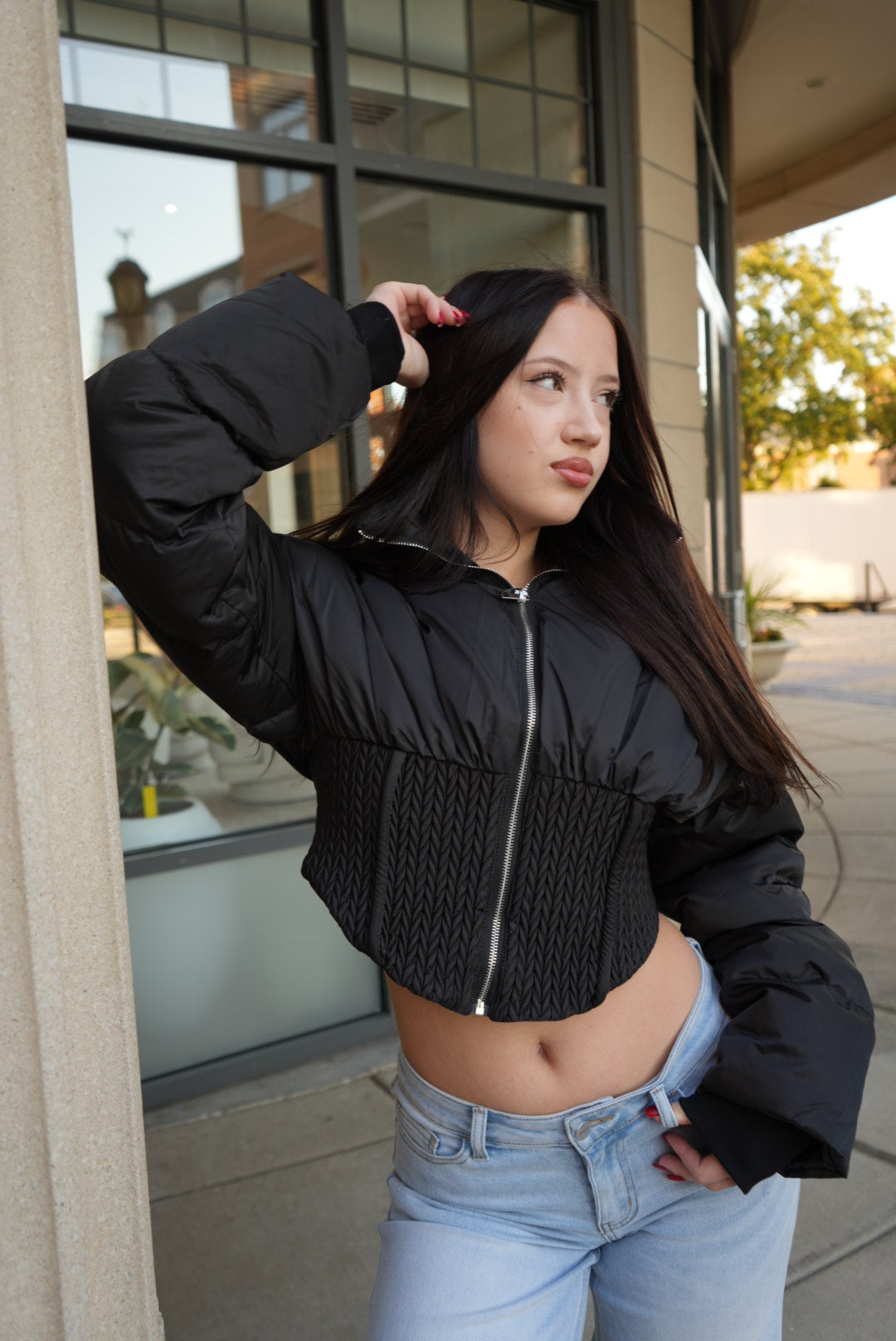 • Designed with a cropped, fitted hem and full puffy shape.