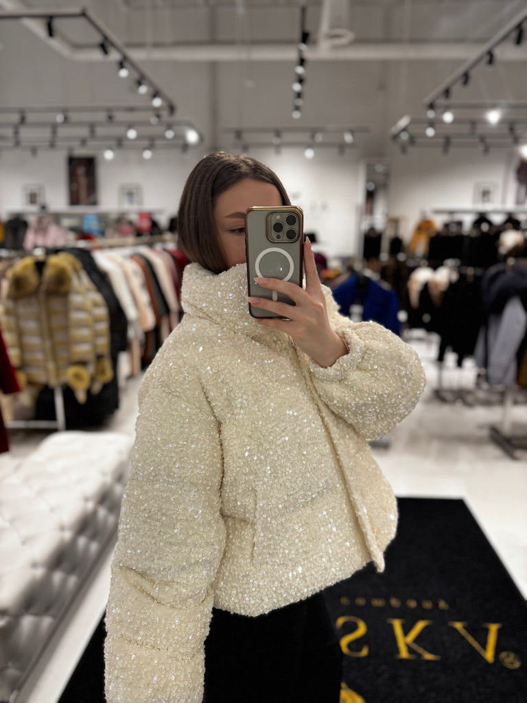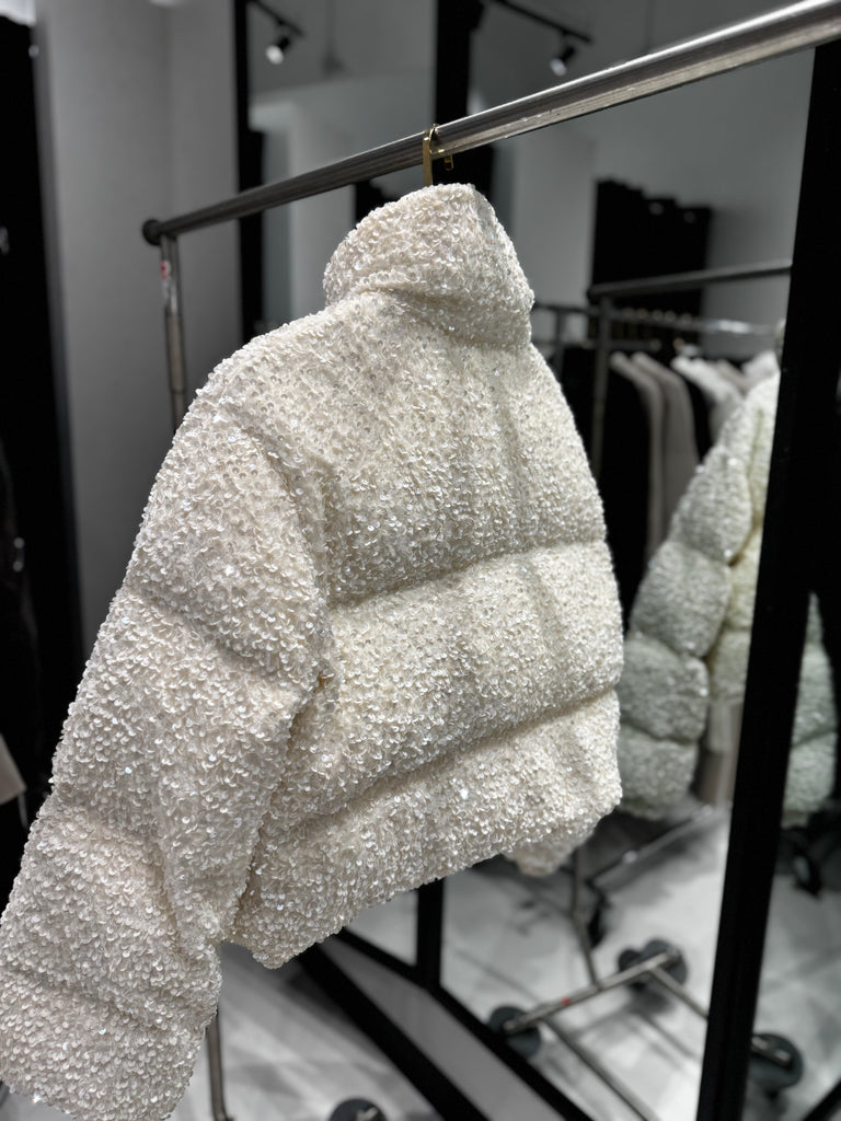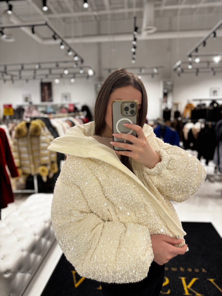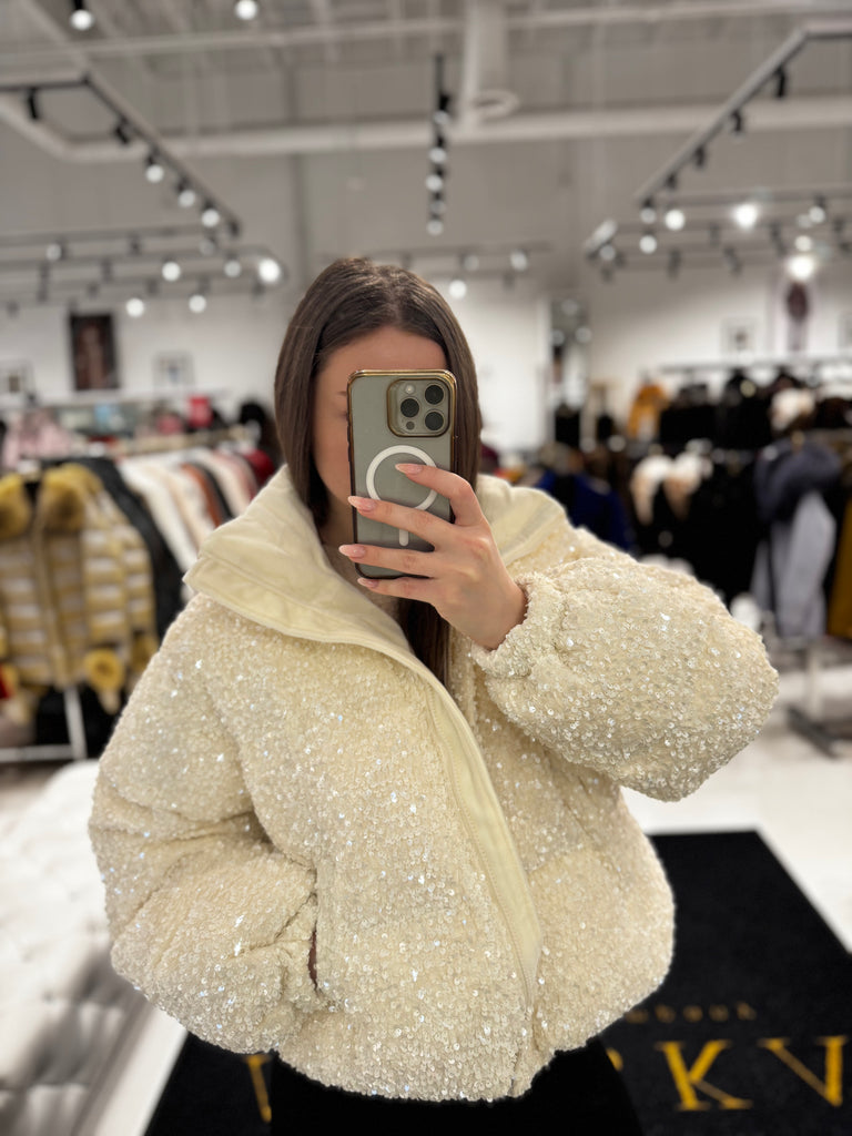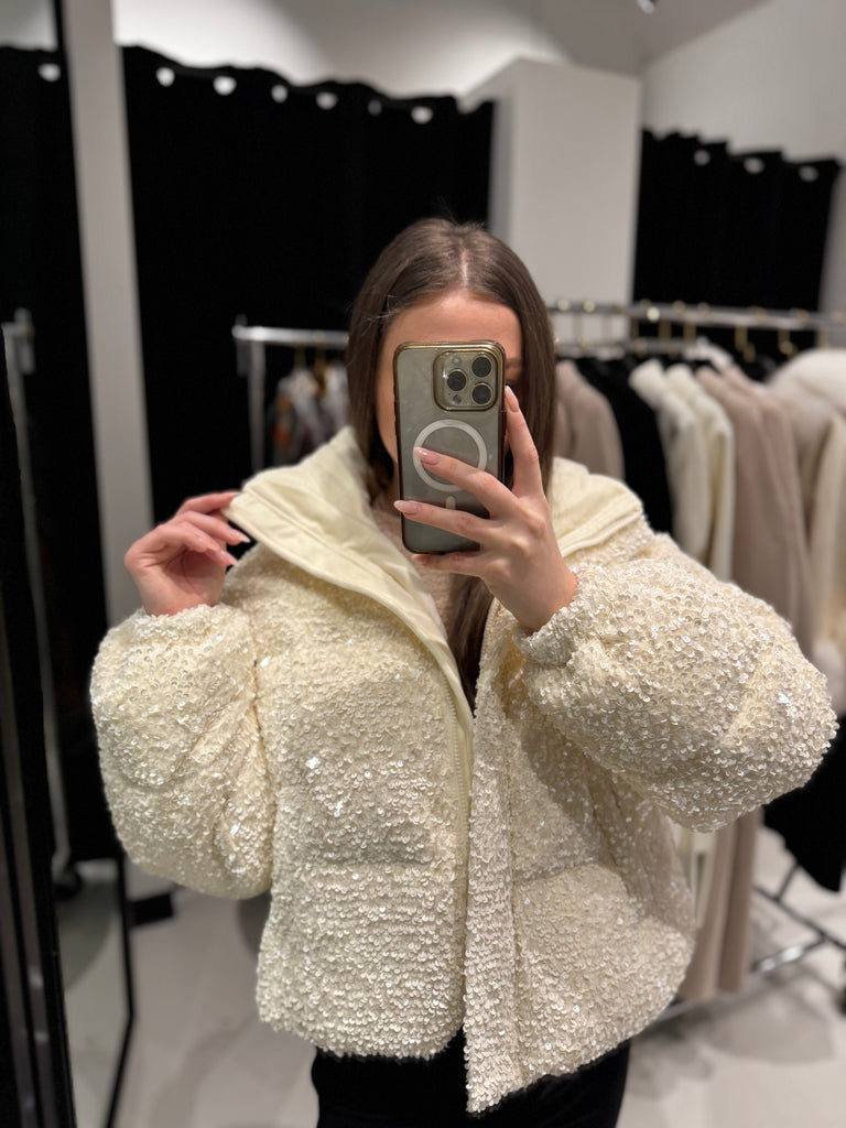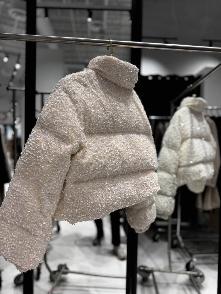 • Fully covered in iridescent sequins for a radiant, high-shine effect