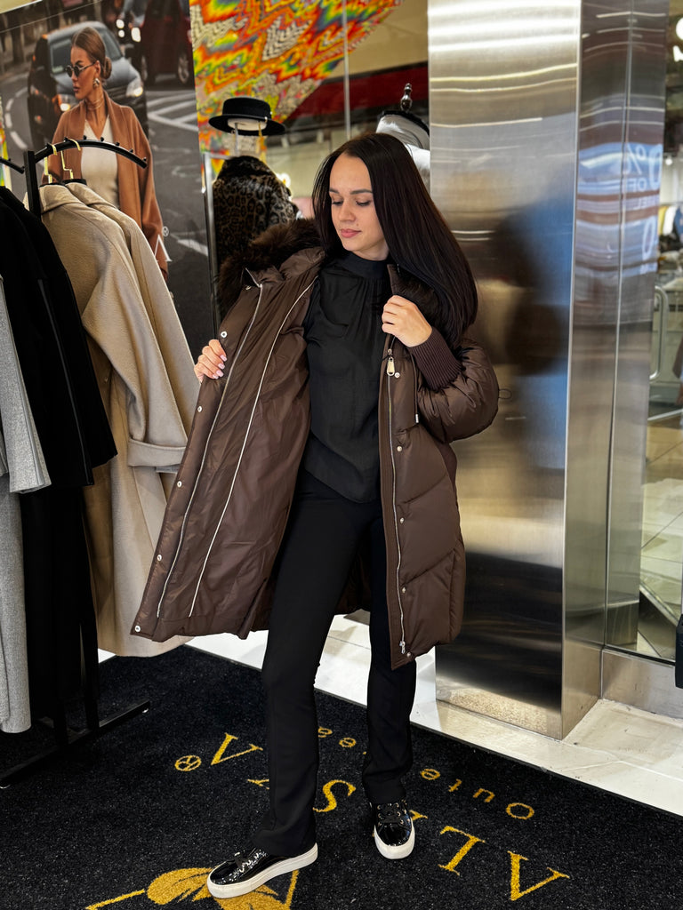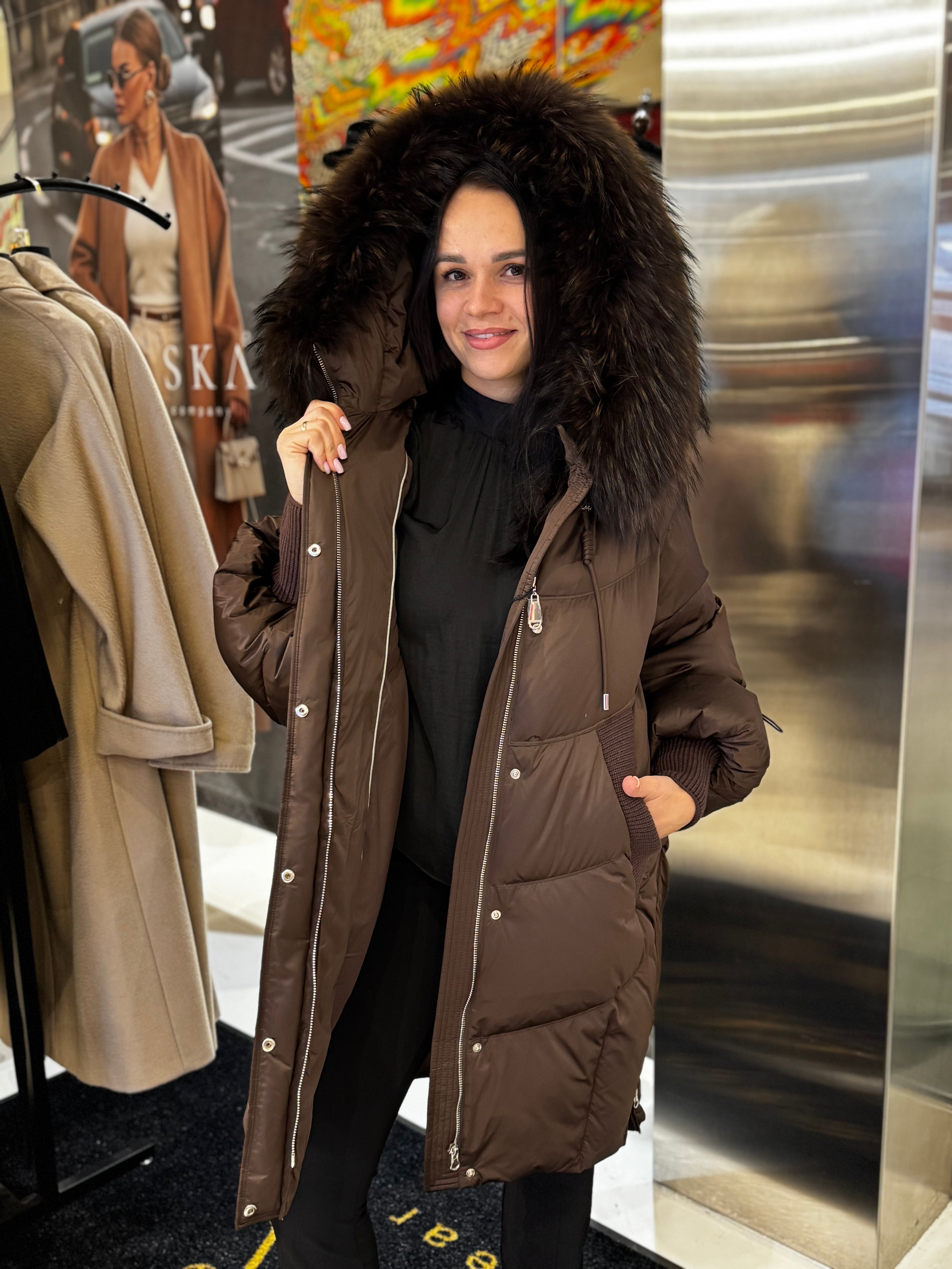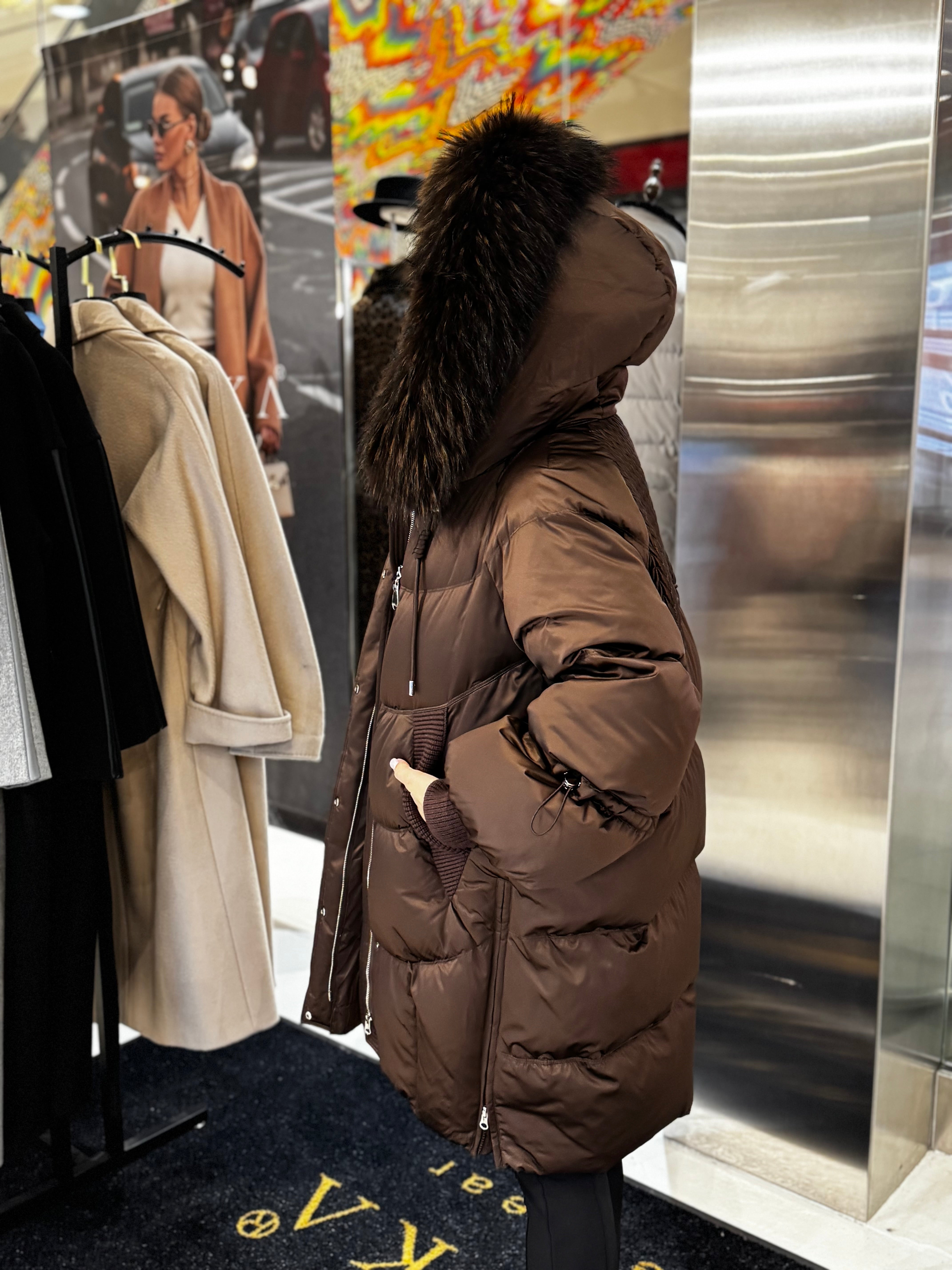 Celeste Genuine Fur Trim Down Fill Coat in Chocolate