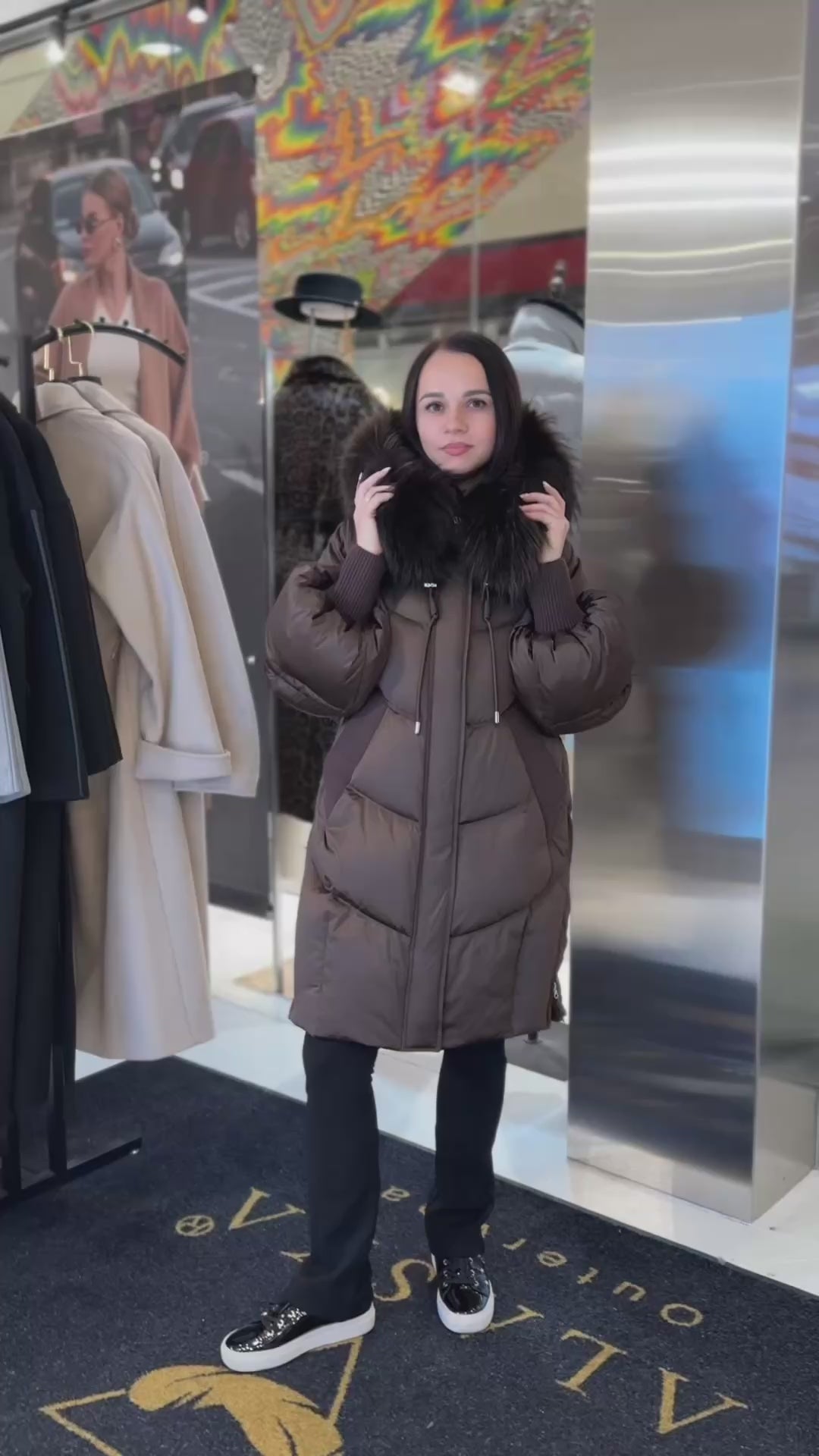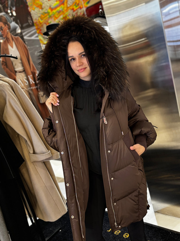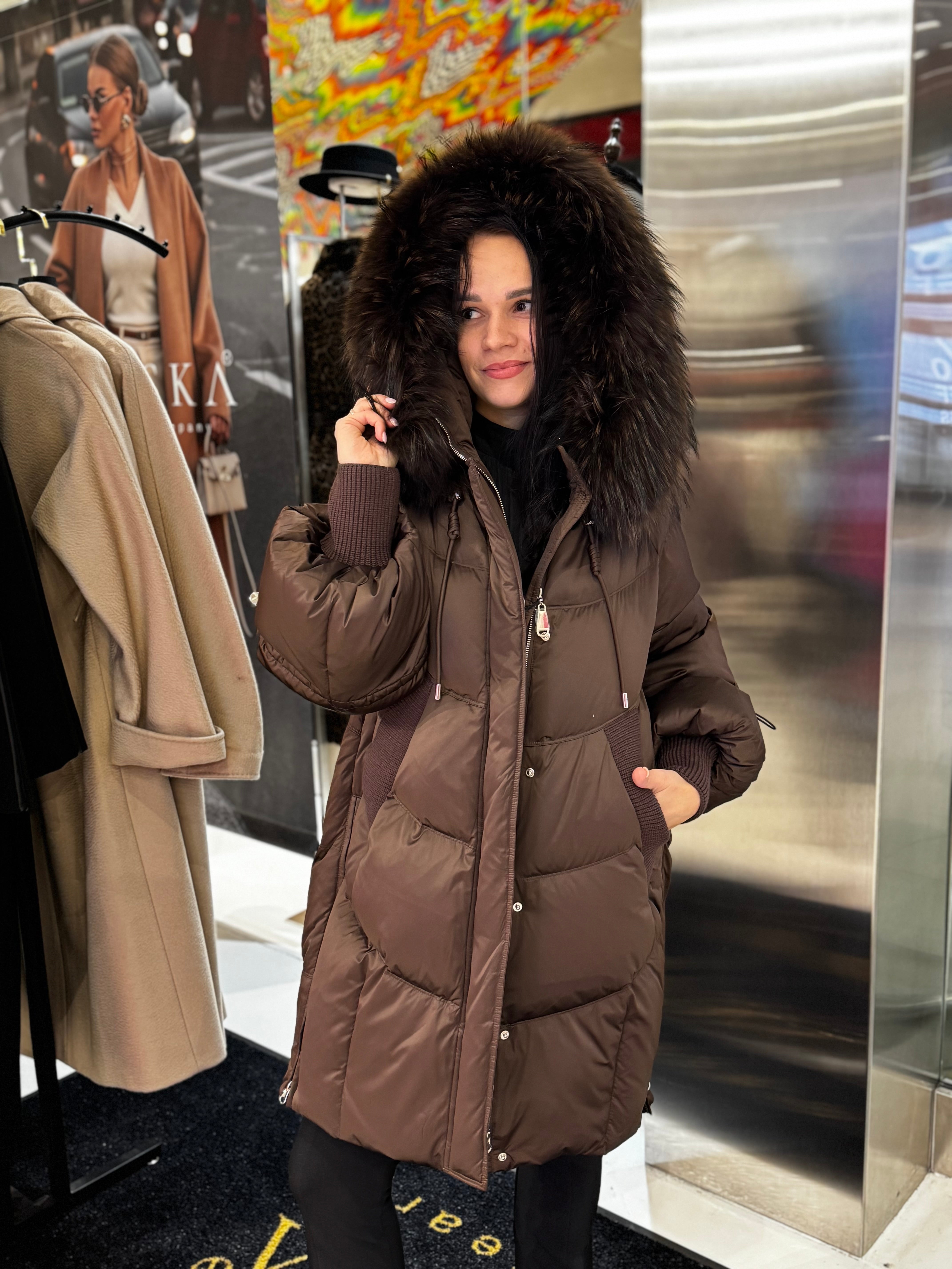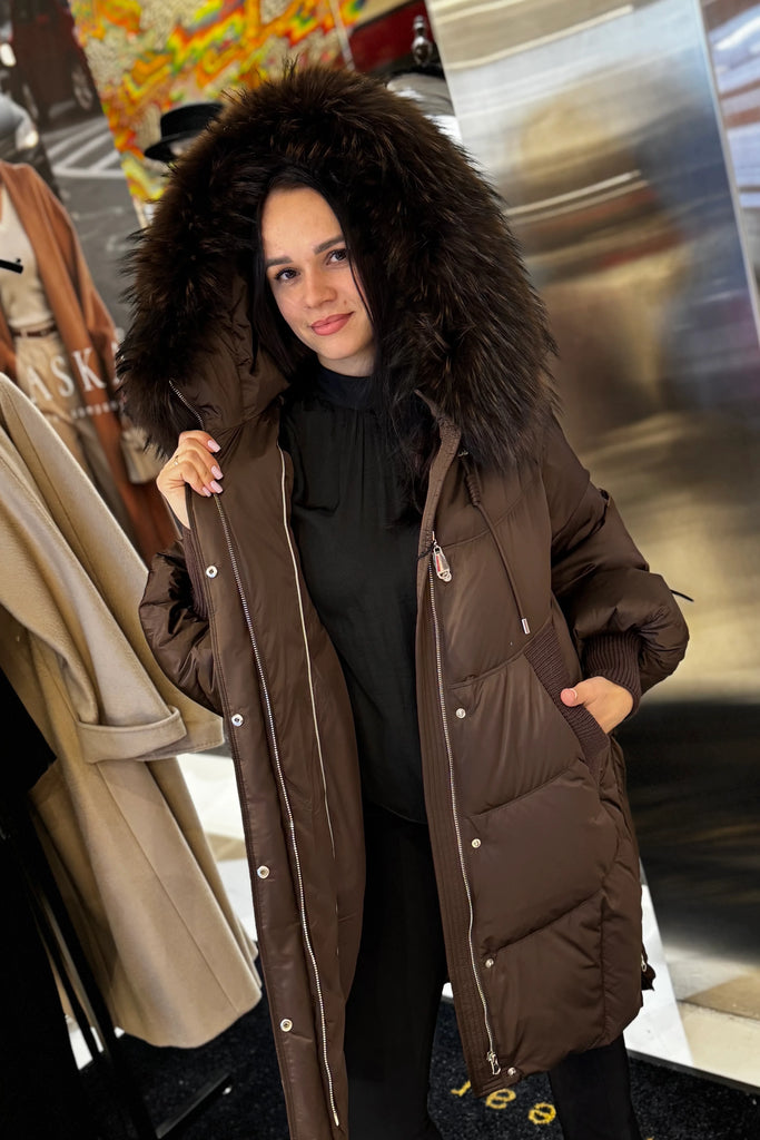 Celeste Genuine Fur Trim Down Fill Coat in Chocolate